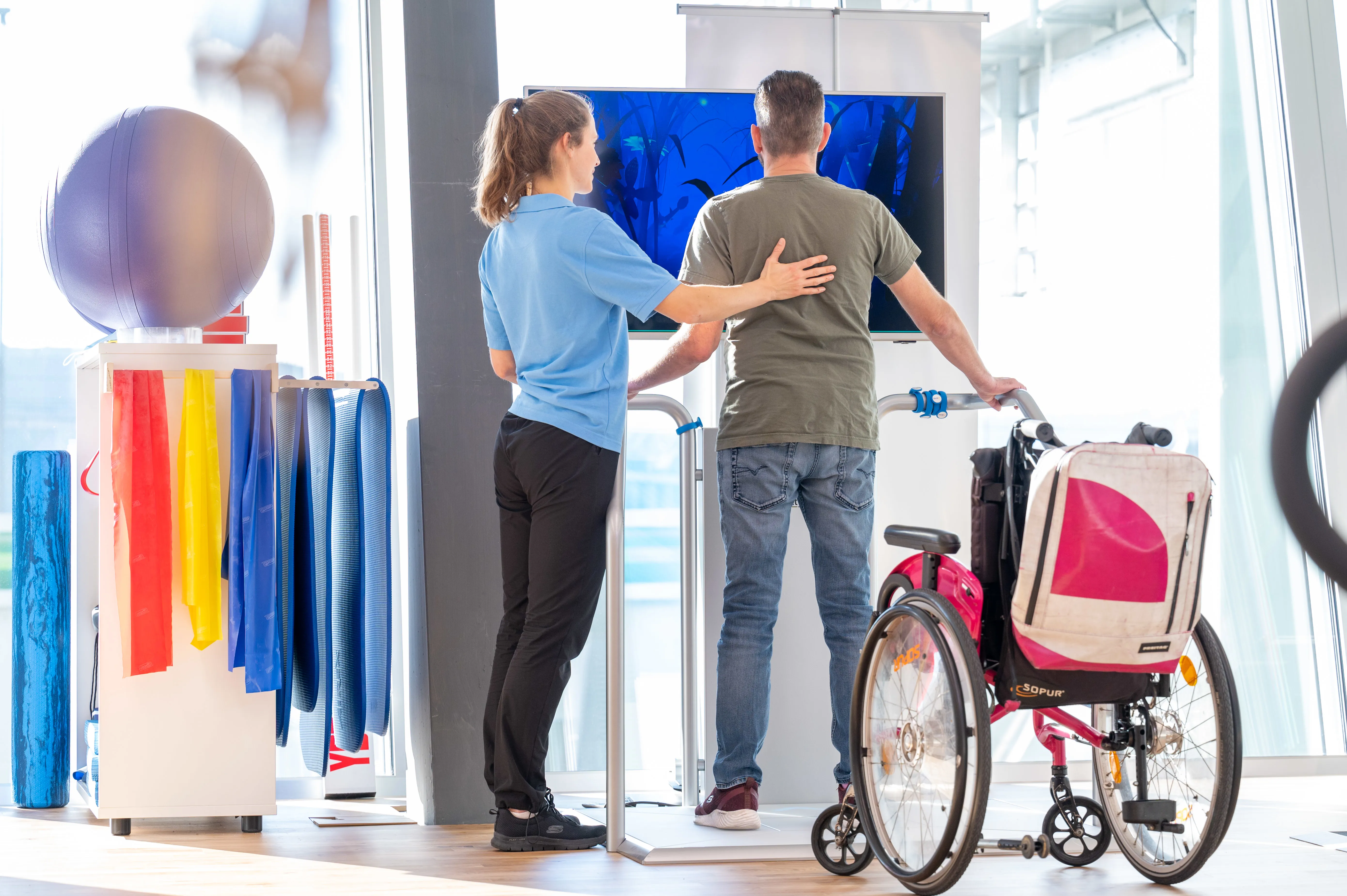 Im Alltag spielt die Gehfähigkeit eine wichtige Rolle. Deshalb legen wir im VAMED Rehazentrum einen speziellen Fokus auf das Gehen in alltäglichen Situationen. Neben dem Laufsteg im Zentrum selbst konfrontieren wir unsere Patientinnen und Patienten auch mit alltäglichen Herausforderungen. Zum Beispiel üben wir Dinge wie Einkaufen im Warenhaus, Tramfahren, Spazieren am See oder das Überqueren einer Strasse. Dabei werden die Patientinnen und Patienten teilweise auch durch Robotik-Geräte unterstützt.